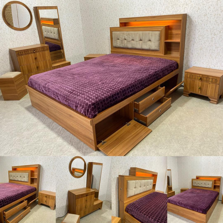 شامل تخت دو نفره با باکس و کشو زیر تخت و جای مخفی در قیمت سر تخت