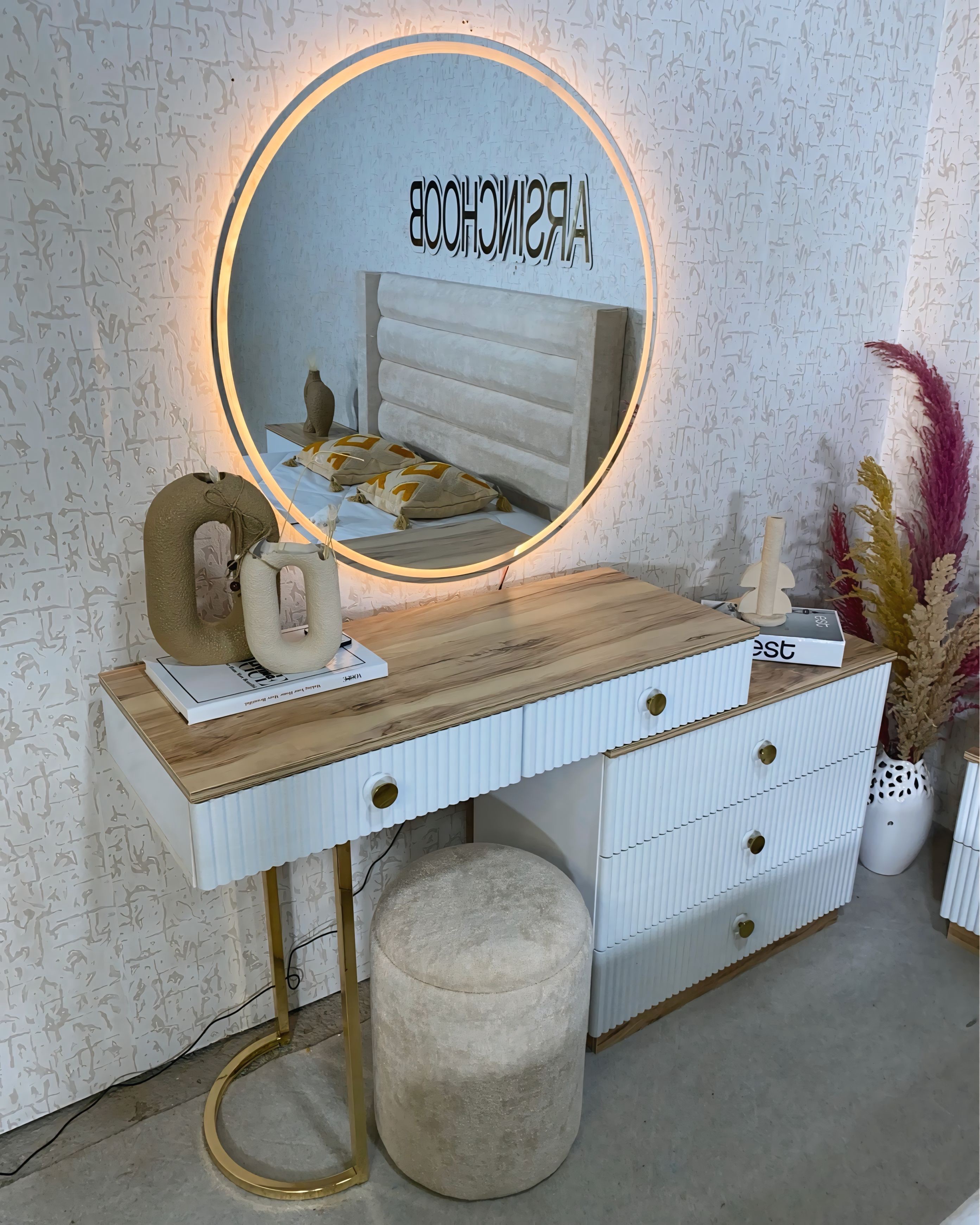 میز آرایش دو تیکه و متحرک به همراه اینه نور پردازی شده و پاف نشیمن گرد تمام پارچه